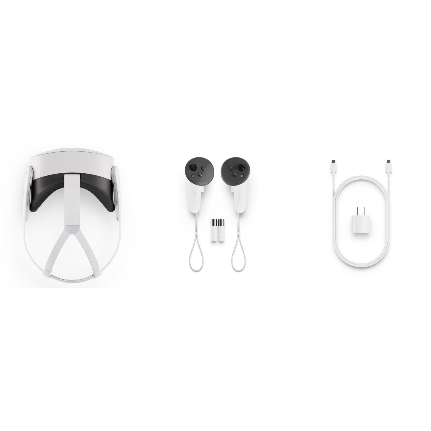 У комплект входять: гарнітура VR OCULUS Meta Quest 3S 128GB, два контролери, зарядний пристрій із портом USB-C, кабель USB-C — USB-C, дві батарейки AA для контролерів та документація.